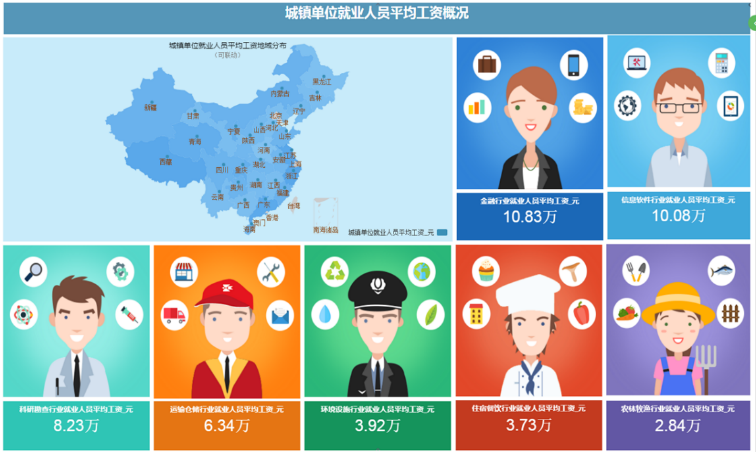 可以看到分省数据中仅挑了几个行业,其实这几个行业是2014年里排名比较靠前和靠后的几个。同时还有时间维度、地理分布,所以我们可以结合这些内容来了解我国各省市各行业的就业平均工资情况。
