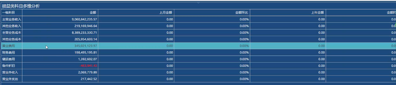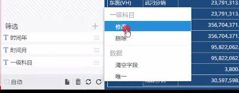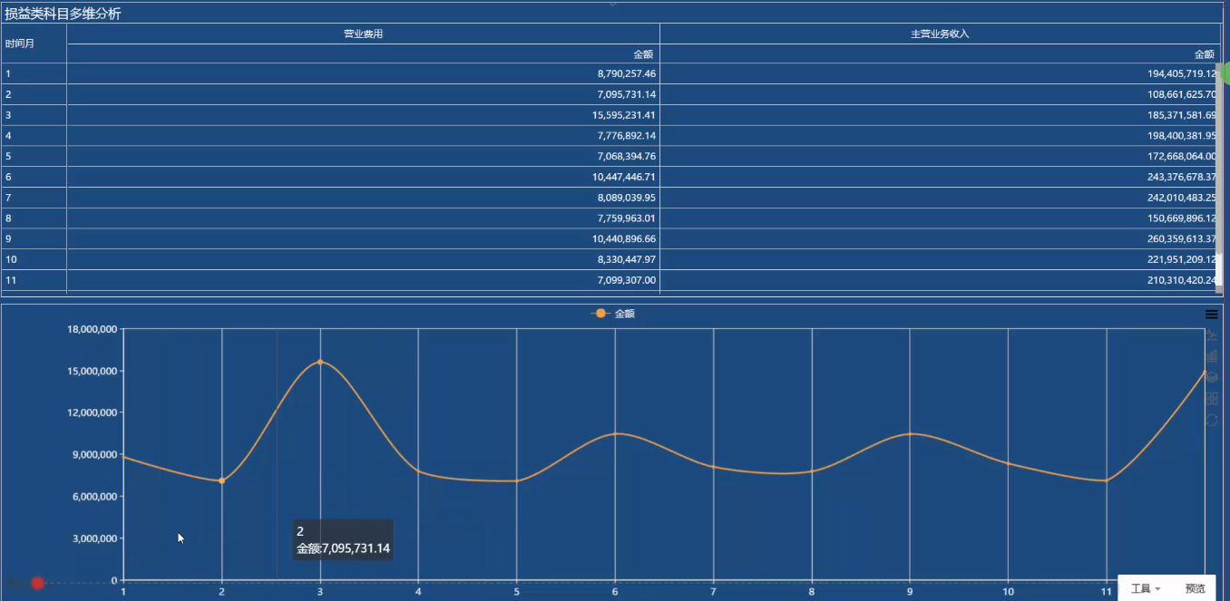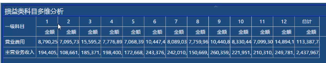 通过数据构建器选定: 营业费用,主营业务收入科目 ,并添加月份到列维度里就可以做出了这个交叉对比分析的报表。