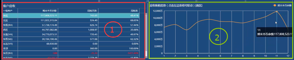 例如:我想查看南区应收款更明细的情况。在“南区“上双击,钻取到《应收余额及周转分析》,大家就可以在图表的标题栏里看到,各个图表显示的均是南区的数据。