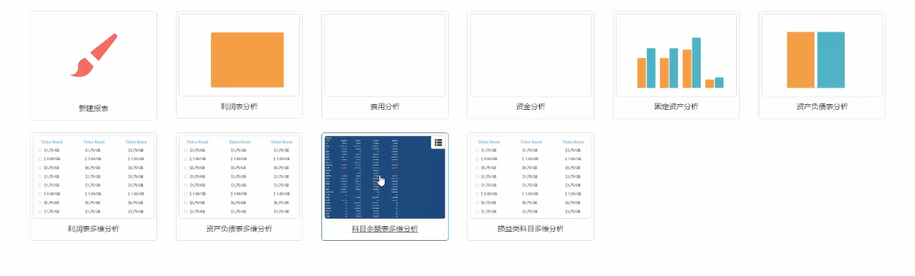 我们进入到财务分析模块,财务模块已经内置了主要有:利润表分析、费用分析、资金分析、固定资产分析、资产负债表分析,还有多个相对应动态多维分析报表。