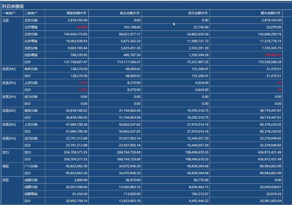我们前面所说的应收分析,它只是展示了应收款前几名的客户,如果我们需要每个客户的应收余额明细记录,我们就可以通过《科目余额表多维分析》快速调整出我们需要的数据。