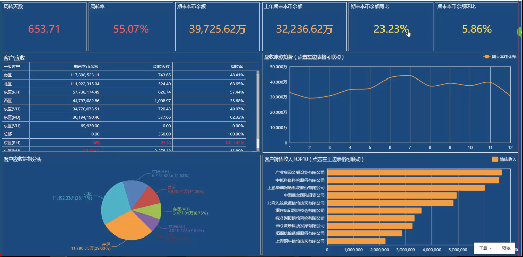 在《应收综合分析》这个报表中,我们可以看到有客户应收数据、客户应收结构分析、应收账款趋势、客户销售收入TOP10四大明细数据表。