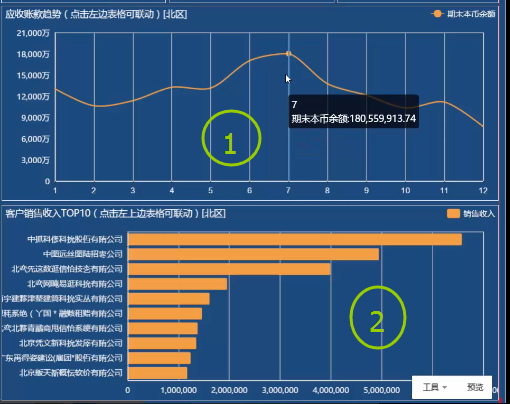 在右下角的条形图同样是联到简表,它展示了当期前10名明细客户的销售情况。