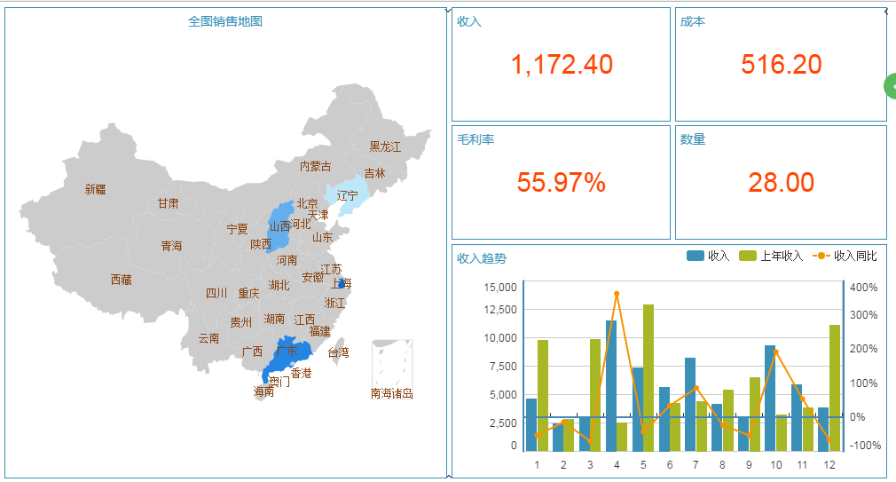 整张报表就做好了,可以通过地图联动、地图钻取,同时也可通过右侧做时间筛选。