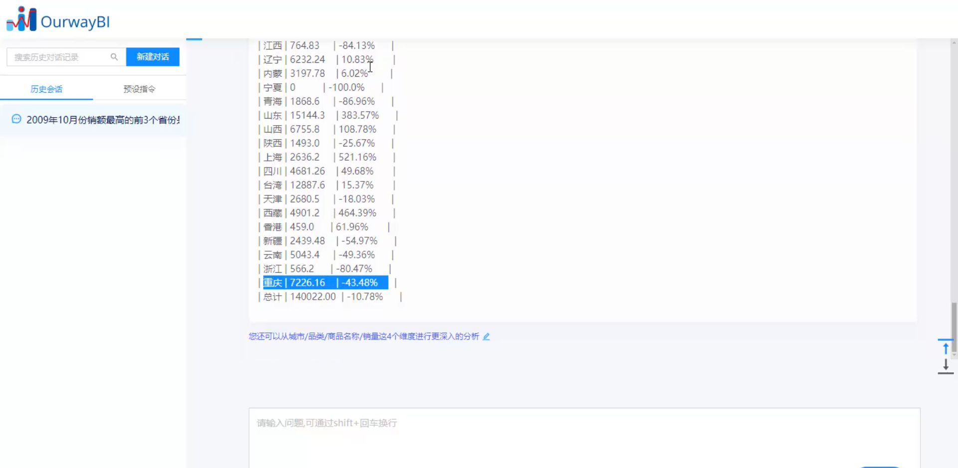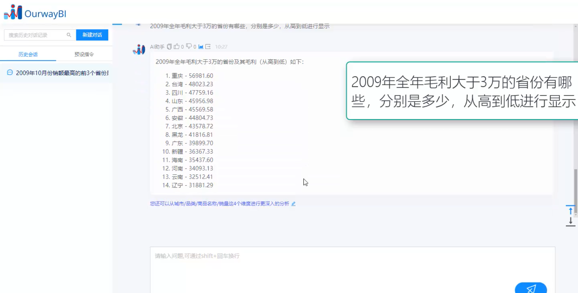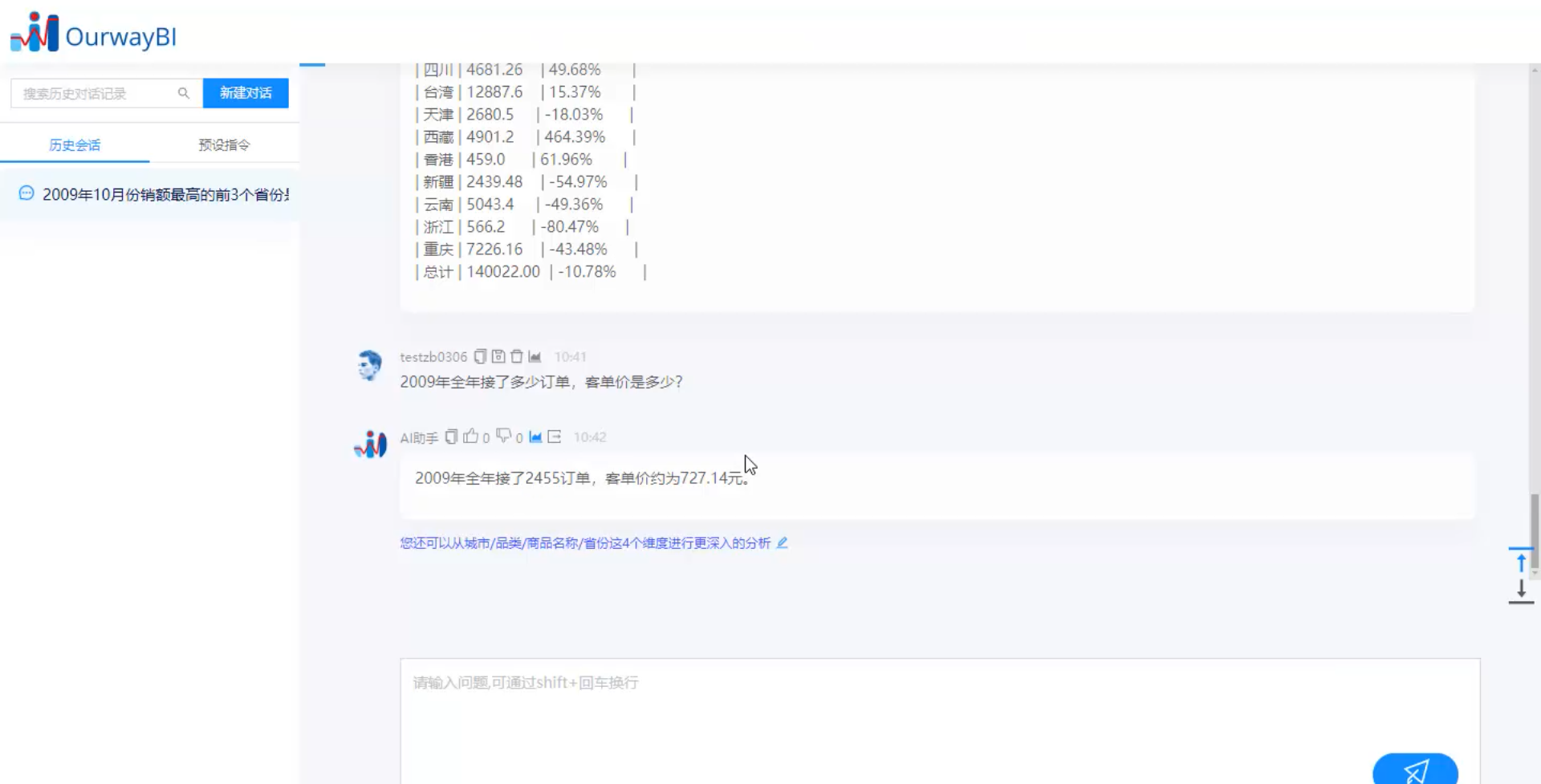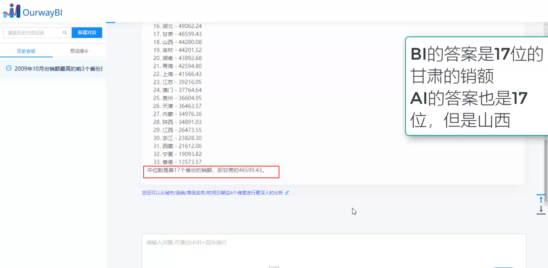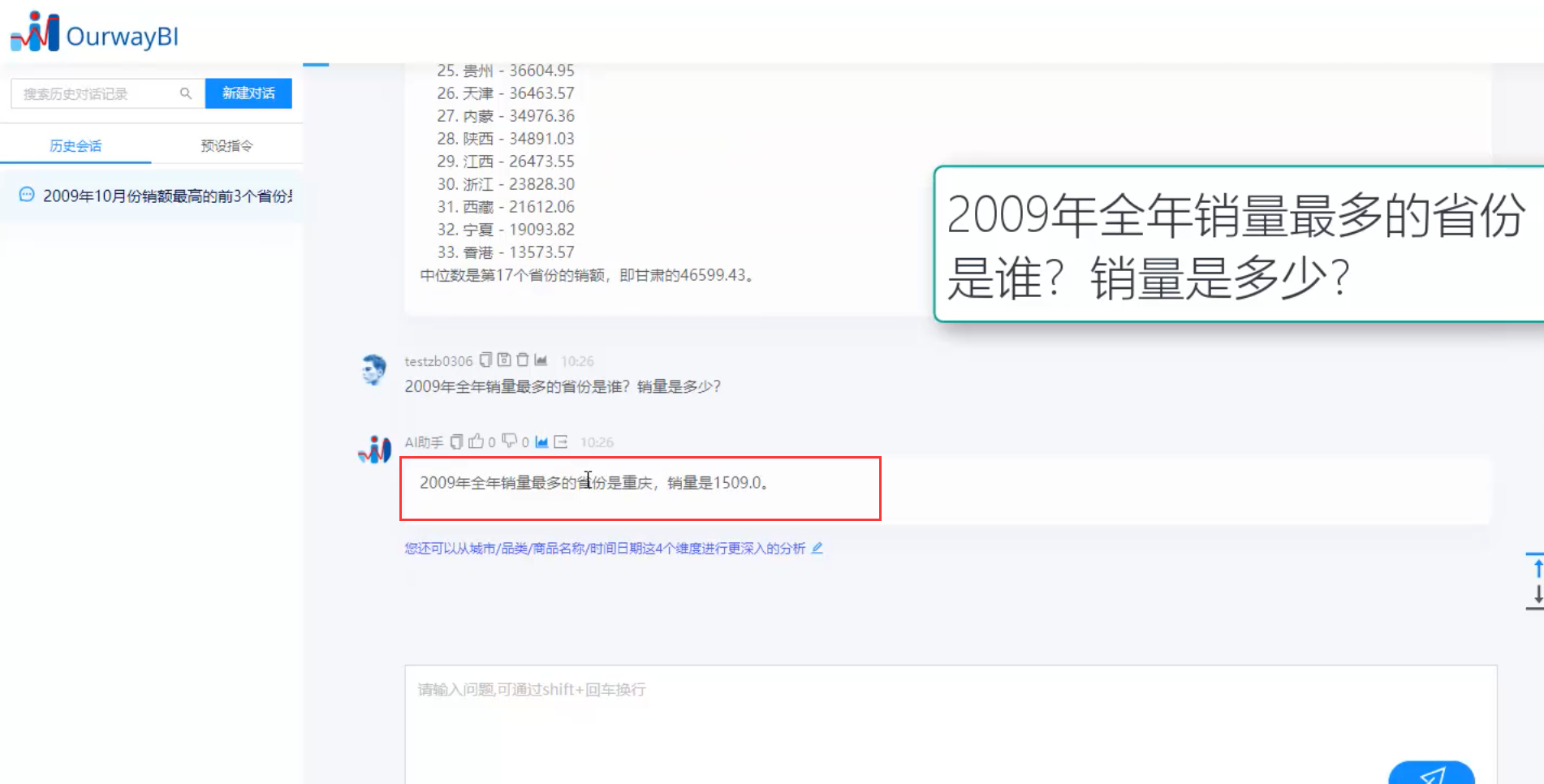 我们继续问,2009年全年销量最多的省份是谁?销量是多少?这次我们发现,AI与BI的答案是一致的。