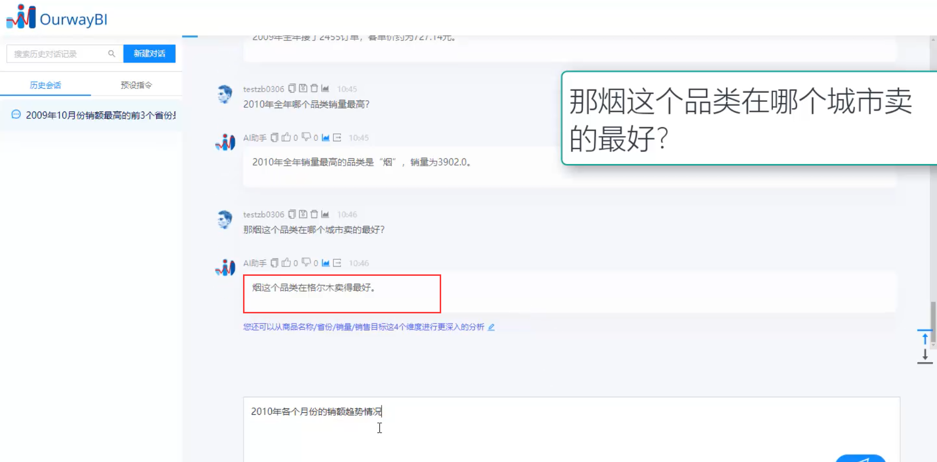 接下来的问题,也都已经超出来AI的范围,比如:2010年全年哪个品类销量最高?卖的好的品类在哪个城市卖的最好?