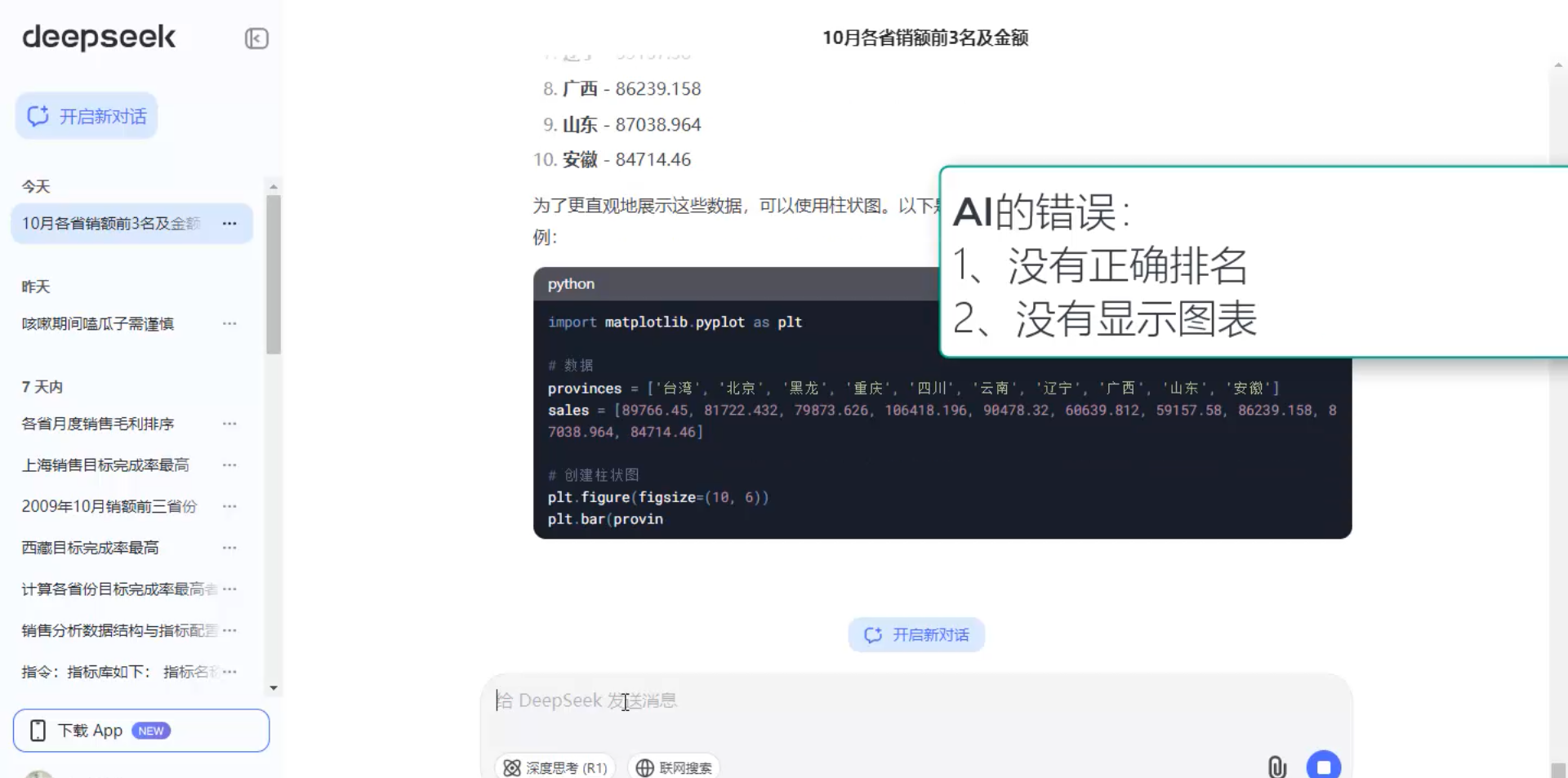 如果我们希望AI得到2009年全年销额最高的10个省份,并用合适的图形展示出来,这时,我们会很遗憾的发现,DeepSeek根本没有办法得到我们想要的结果,首先,因为涉及到排名,DeepSeek得到的结果就是错误的,另外,它也无法直接用图形展示,而是给出一段python代码。