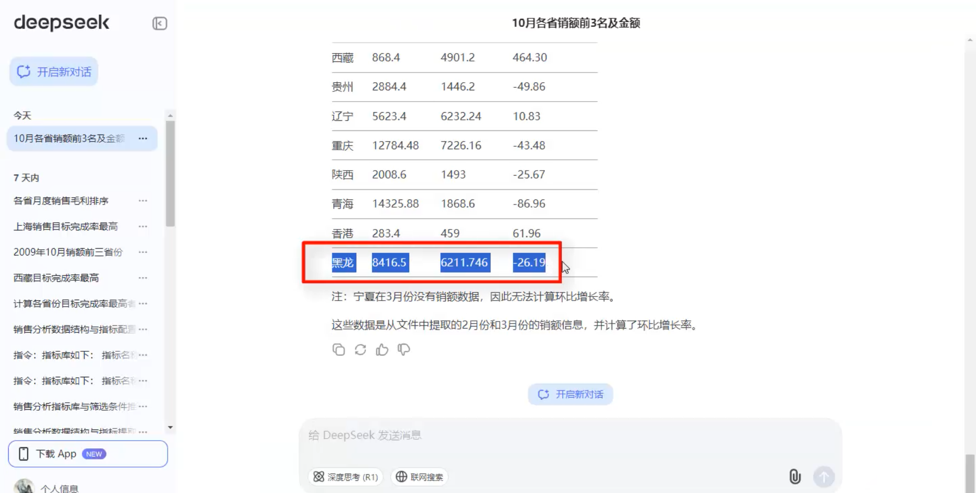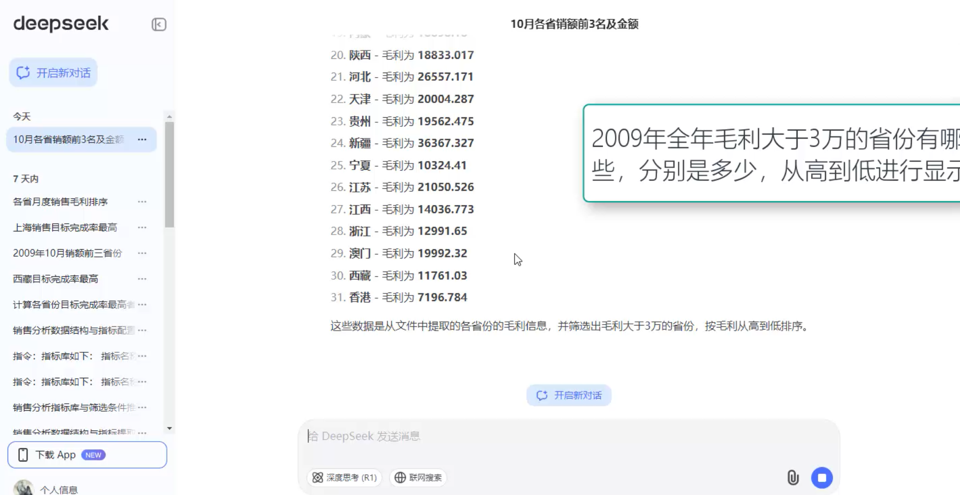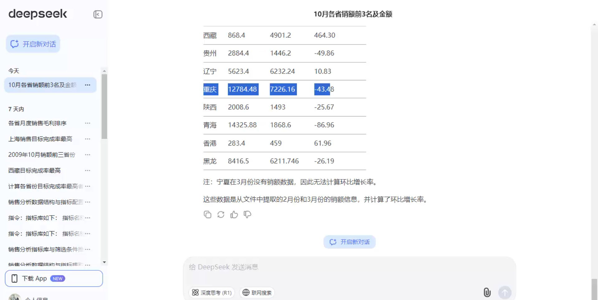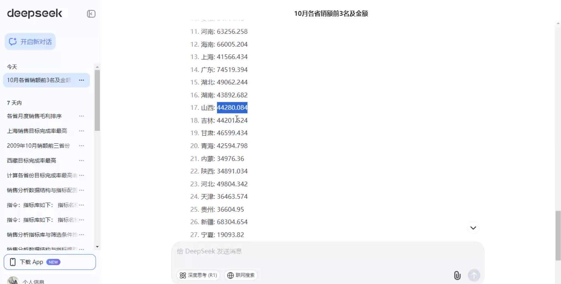 首先,我们先来问一下DeepSeek:10月份销额最高的前3个省份是谁?销额分别是多少?DeepSeek经过分析之后,得到这样的答案:前三名是上海、云南与北京。