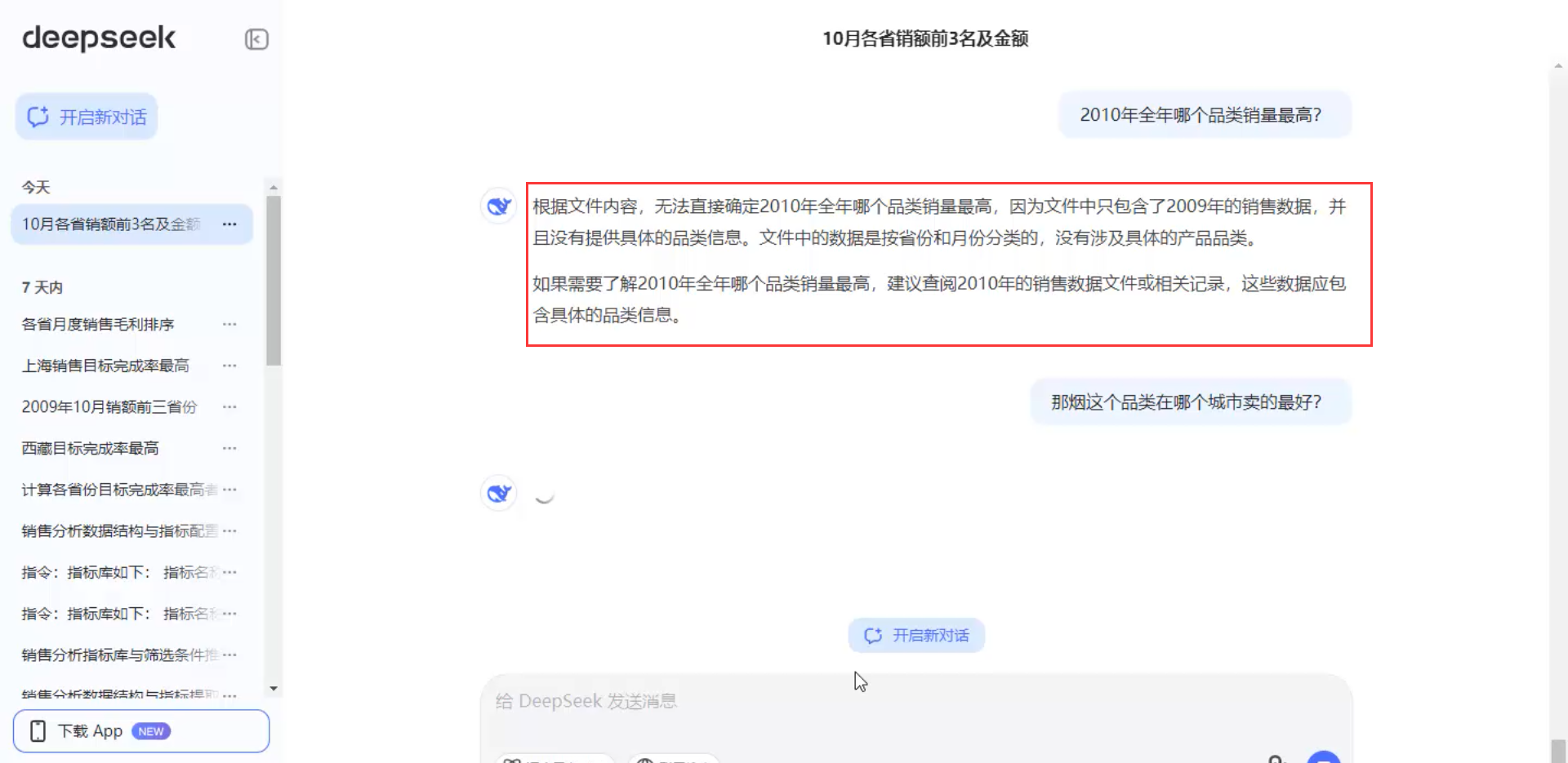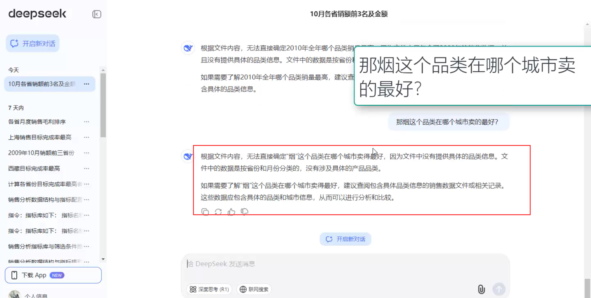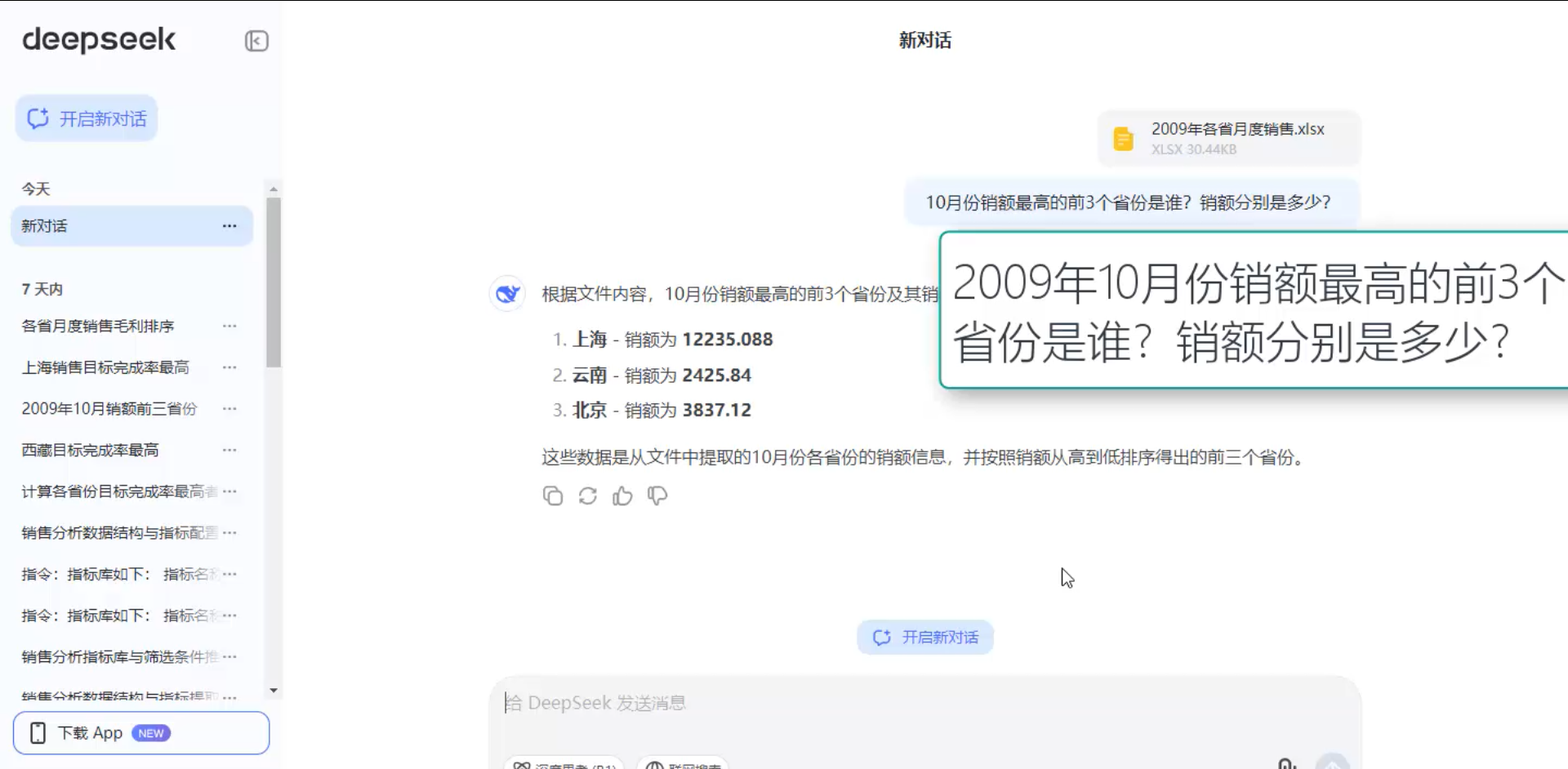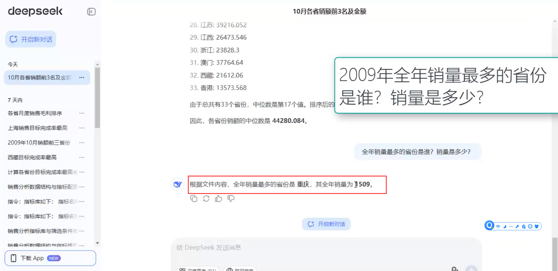 首先,我们先来问一下DeepSeek:10月份销额最高的前3个省份是谁?销额分别是多少?DeepSeek经过分析之后,得到这样的答案:前三名是上海、云南与北京。