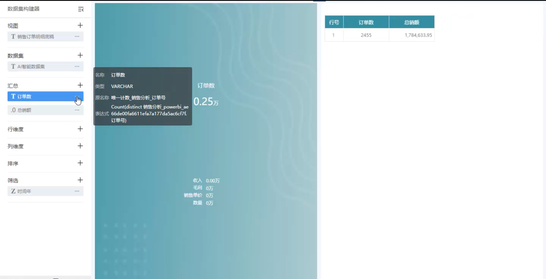 我们再来看BI,答案是不是正确的呢?我们可以验证一下,进入到BI后台生成的数据集,这里可以看到,系统准确的通过订单号的唯一计数来计算订单量,然后通过销额除以订单量得到了客单价。
