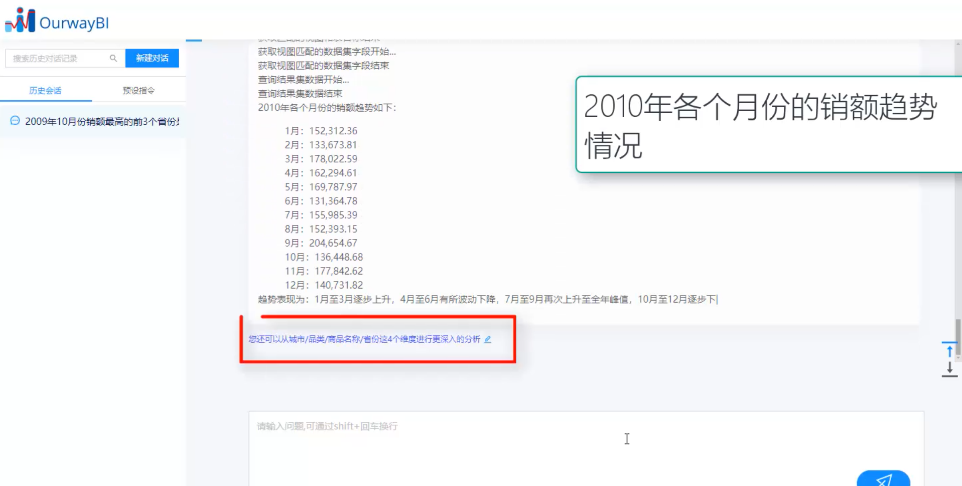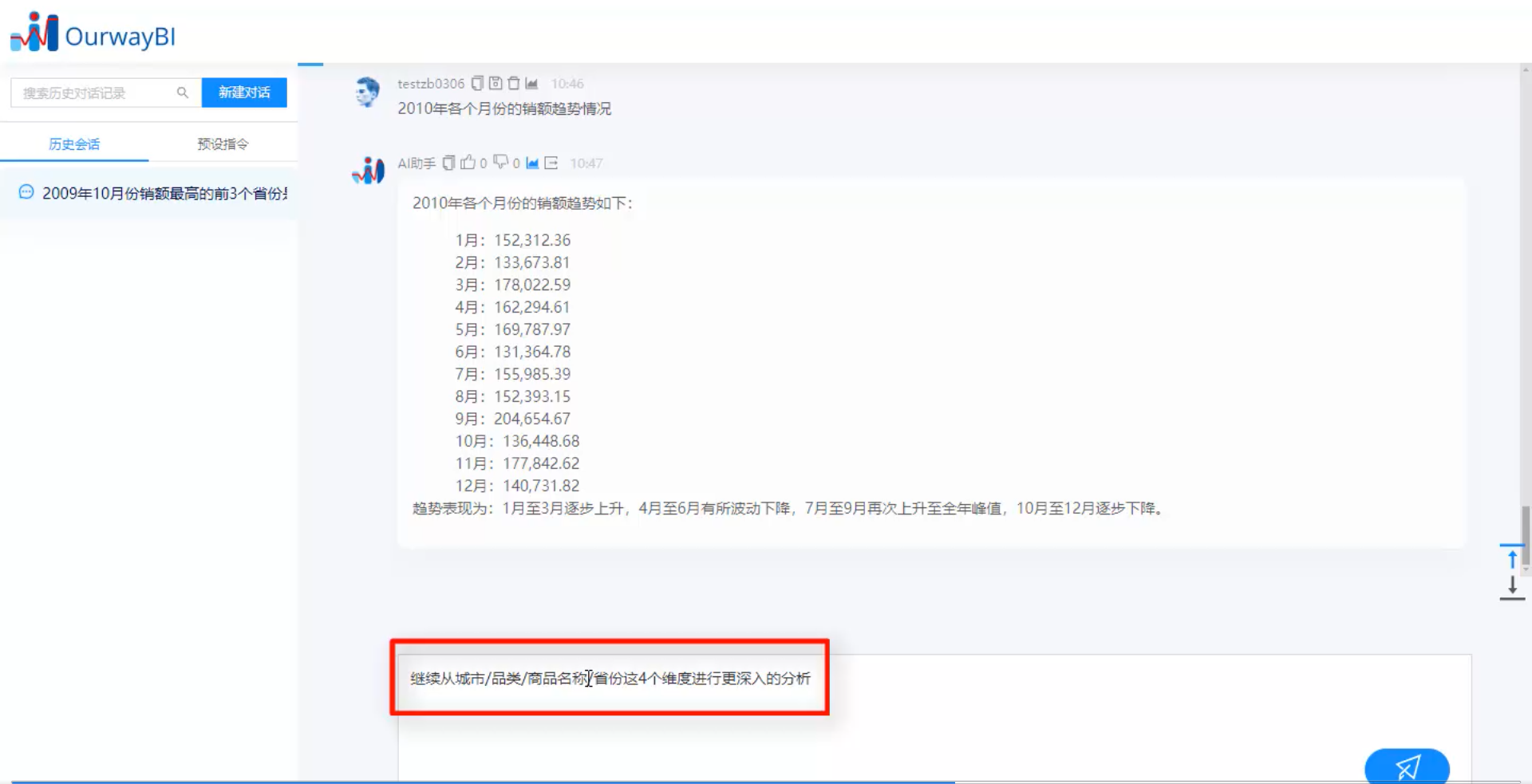 我们拿同样的问题问一下奥威BI,这里注意,因为奥威BI上传的是完整数据,里面还包括了2010年数据,所以,同样的问题,要加上2009年这个条件。