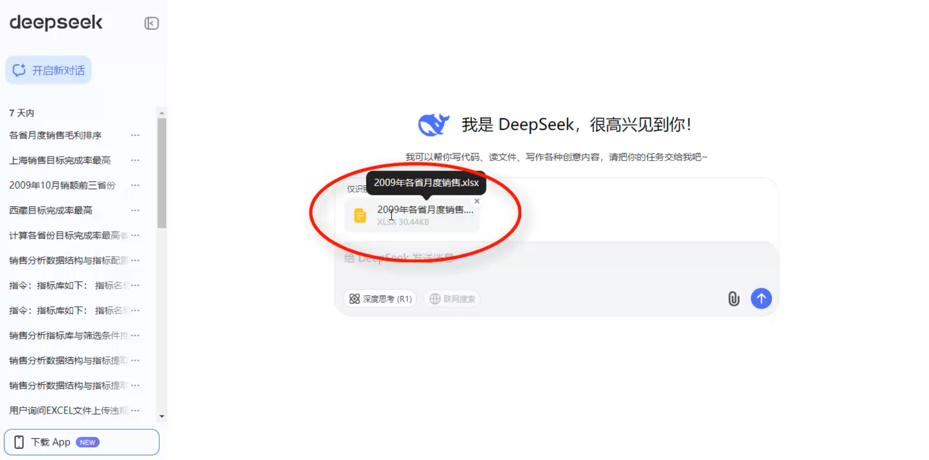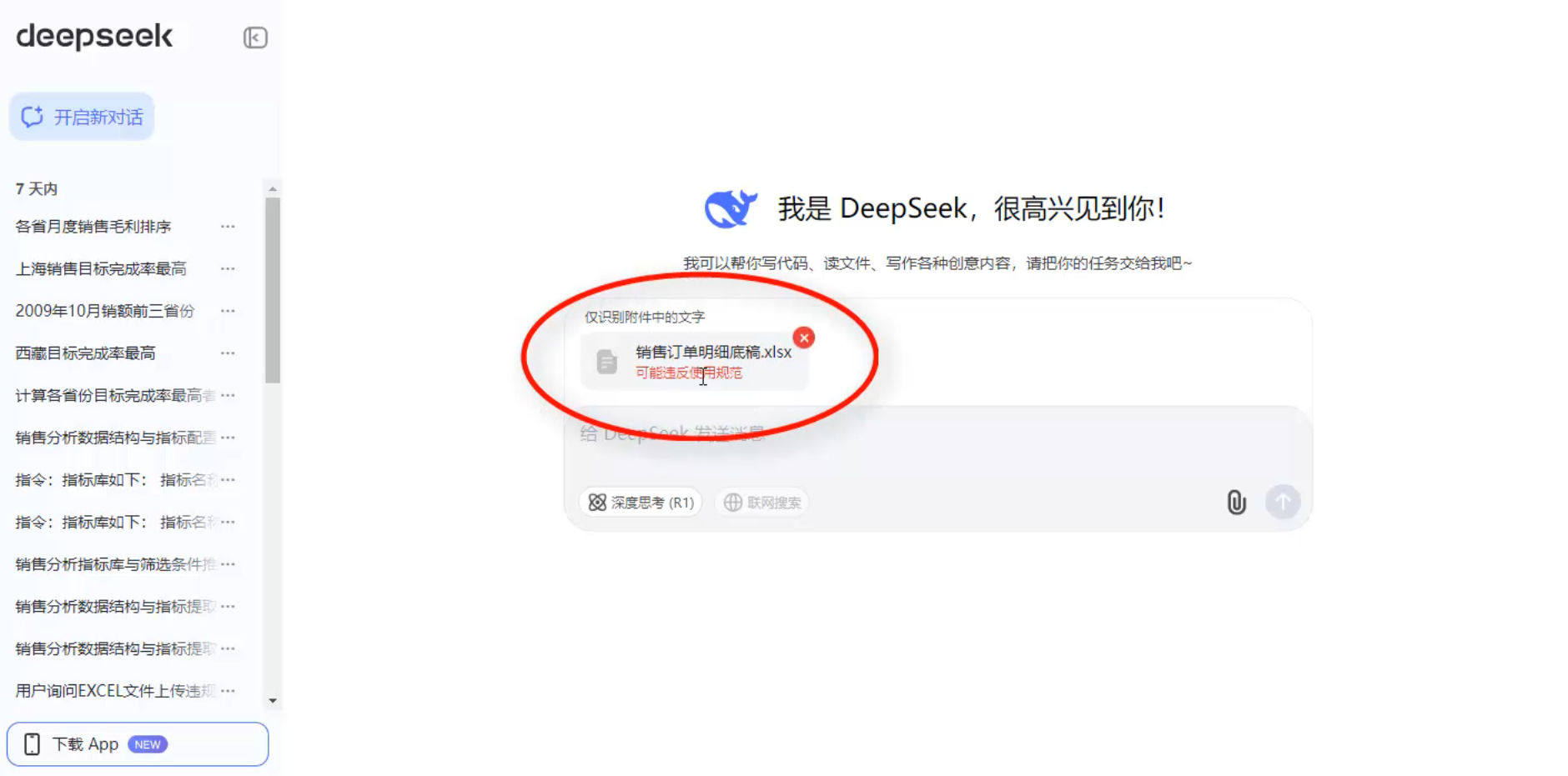 我们尝试将这份EXCEL文件上传给DeepSeek,但是,提示不符合规范,应该是文件太大。