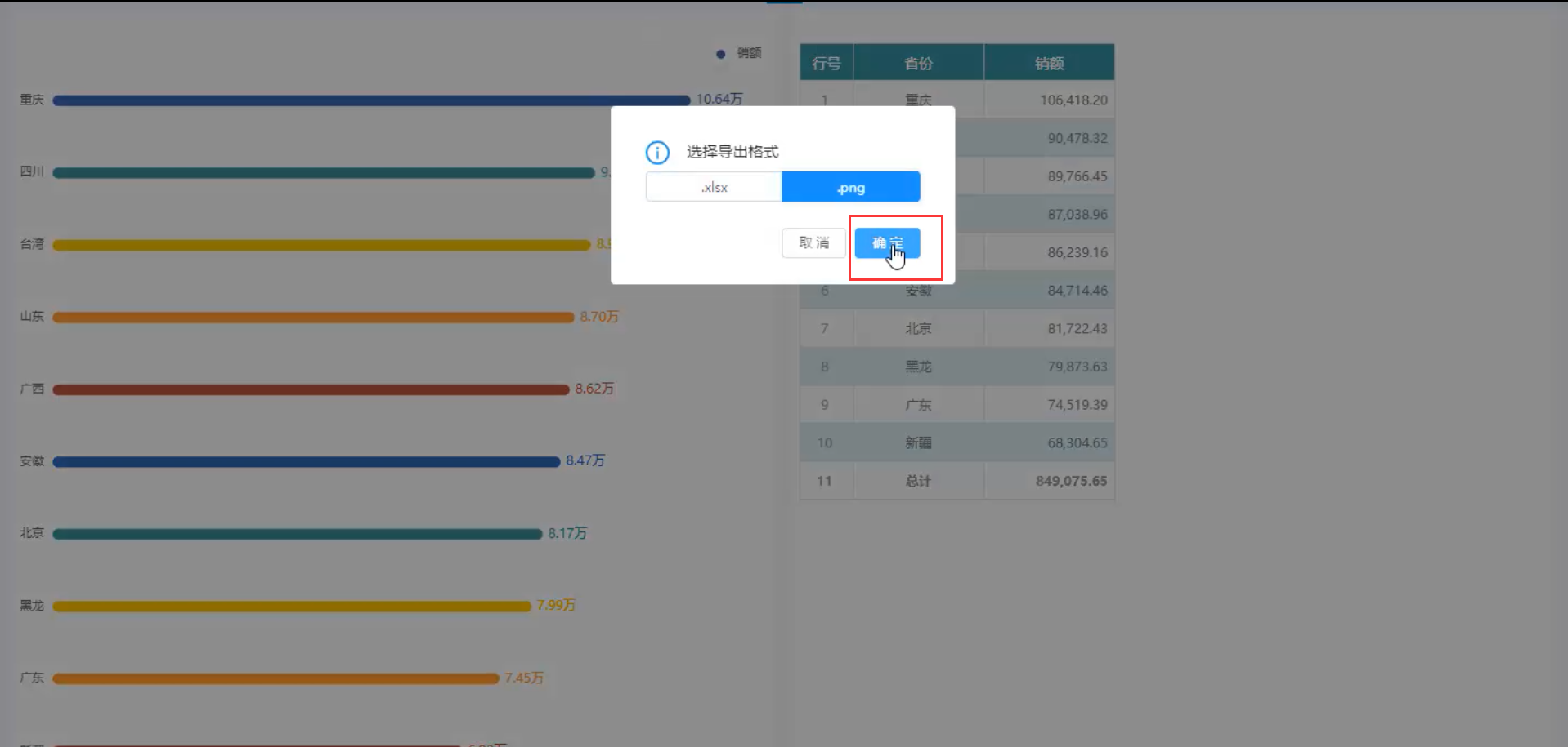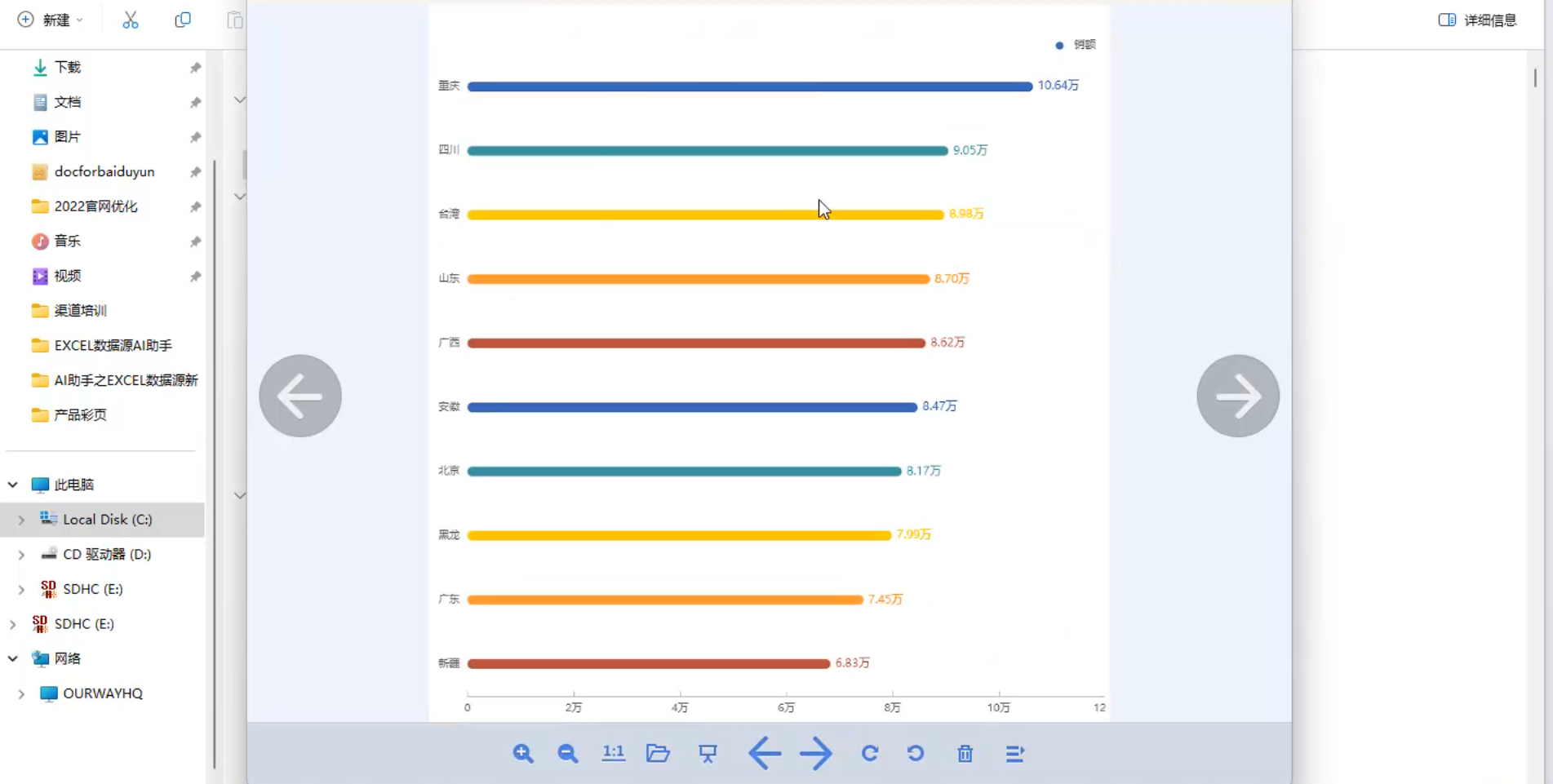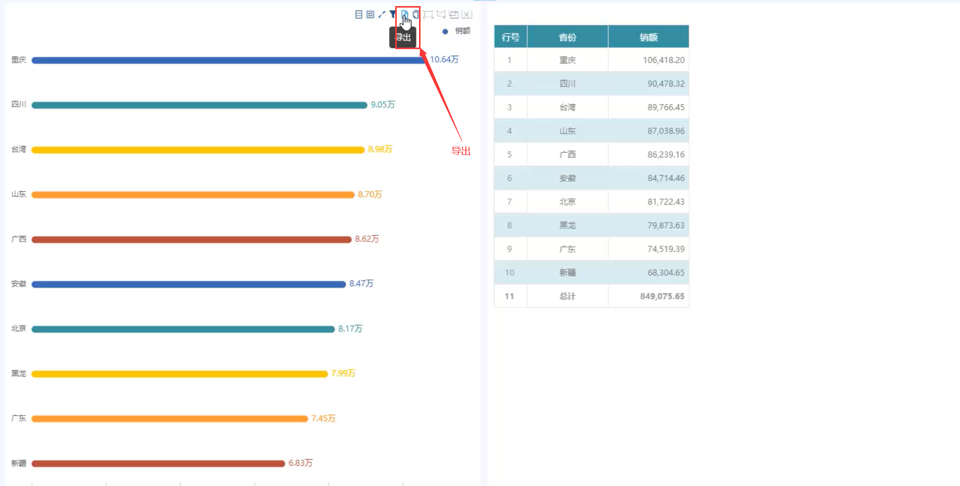 我们再来对比一下BI,我们只要问2009年全年销额最高的10个省份这个问题,最终发现,BI不但能得到正确的结果,还生成了一个条形图。如果我们需要这个条形图,就可以将其导出图片文件。