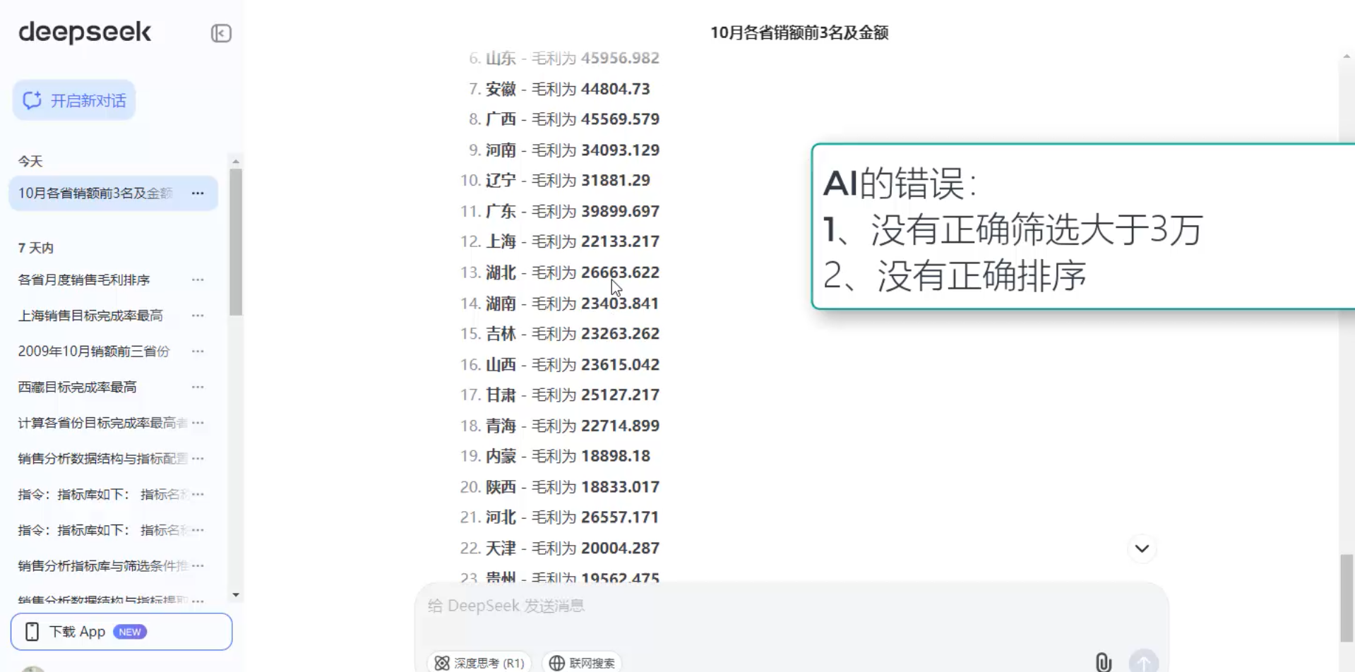 这时,我们发现AI犯了两种错误,一种是没有正确筛选毛利大于3万这个条件,同时,排序也是错误的。