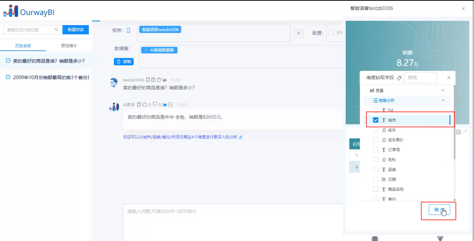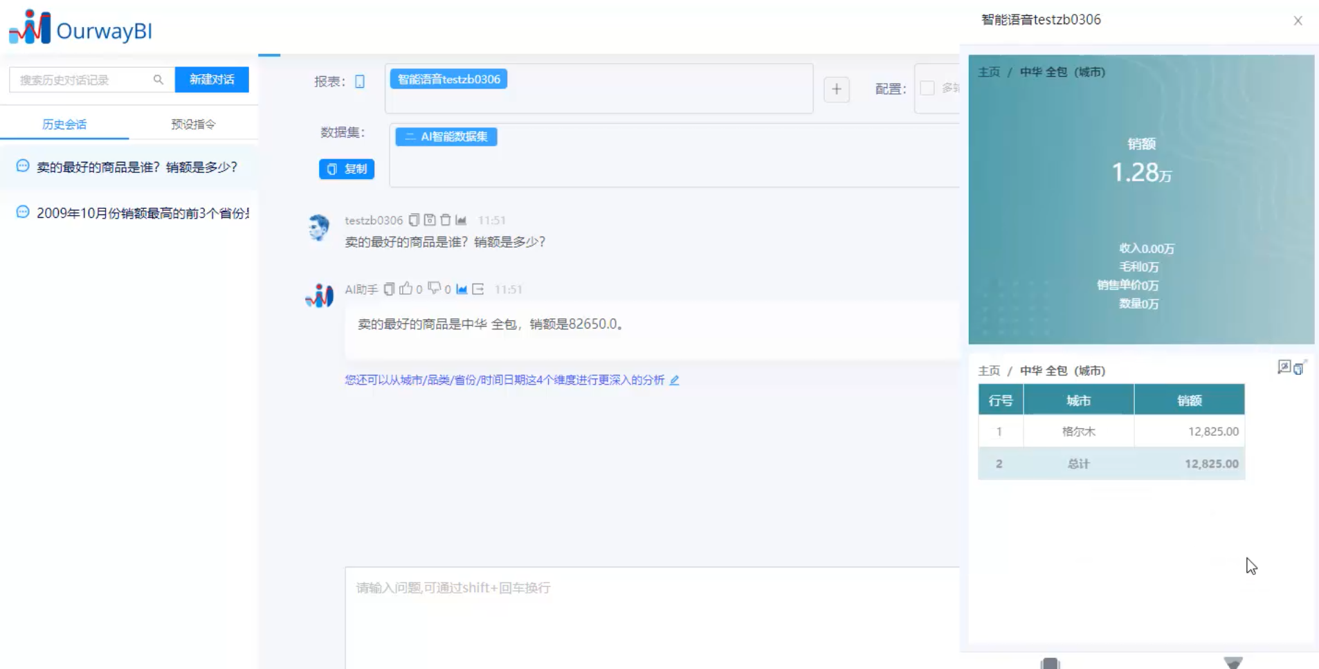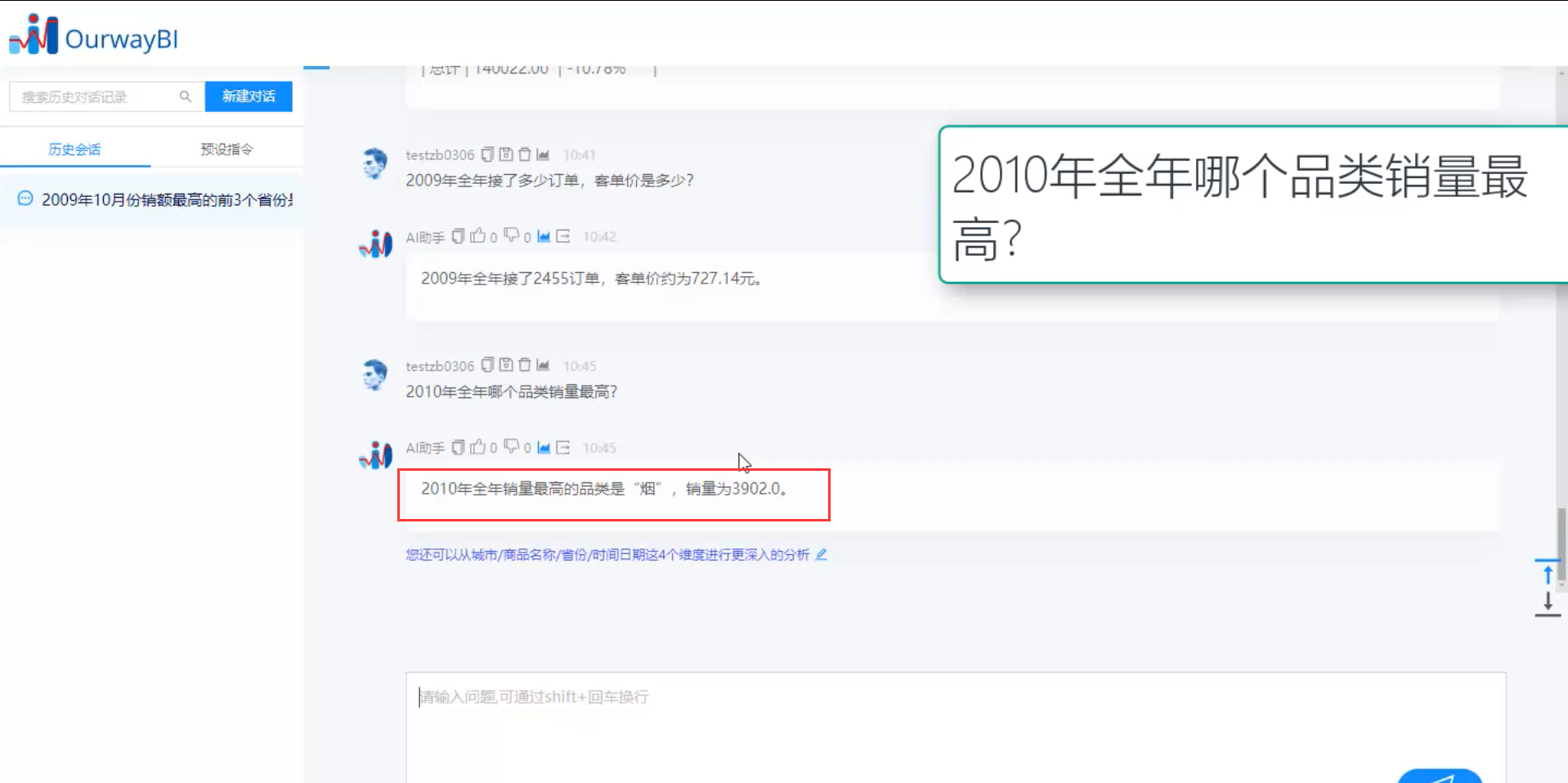 当然,大家会发现,每问一个问题,AI回答问题时,还是会需要花一些时间的,其实在BI中,也不需要什么都问AI,比如我们问BI:卖的最好的商品是谁?销额是多少?