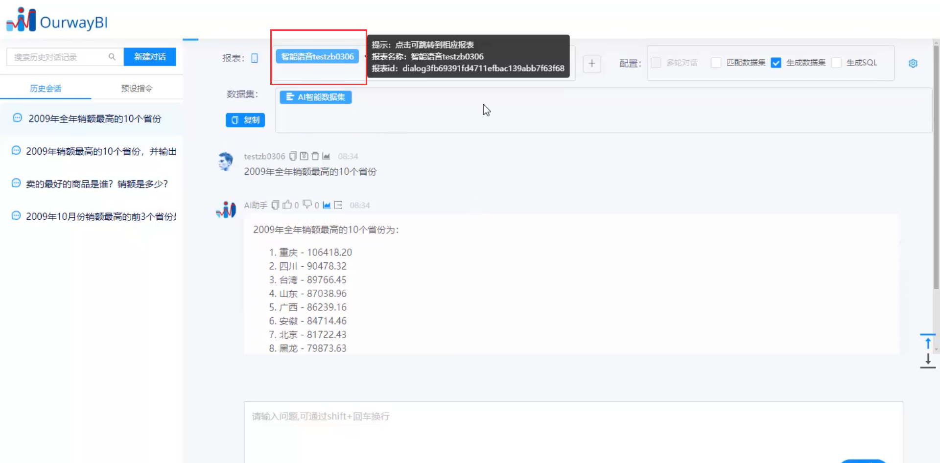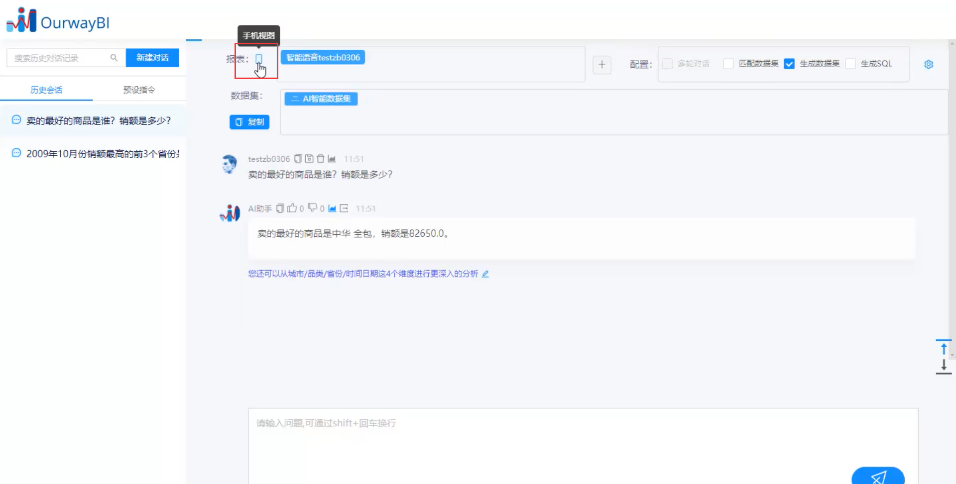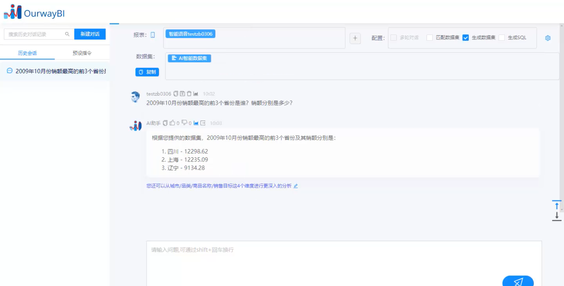 当然,大家会发现,每问一个问题,AI回答问题时,还是会需要花一些时间的,其实在BI中,也不需要什么都问AI,比如我们问BI:卖的最好的商品是谁?销额是多少?