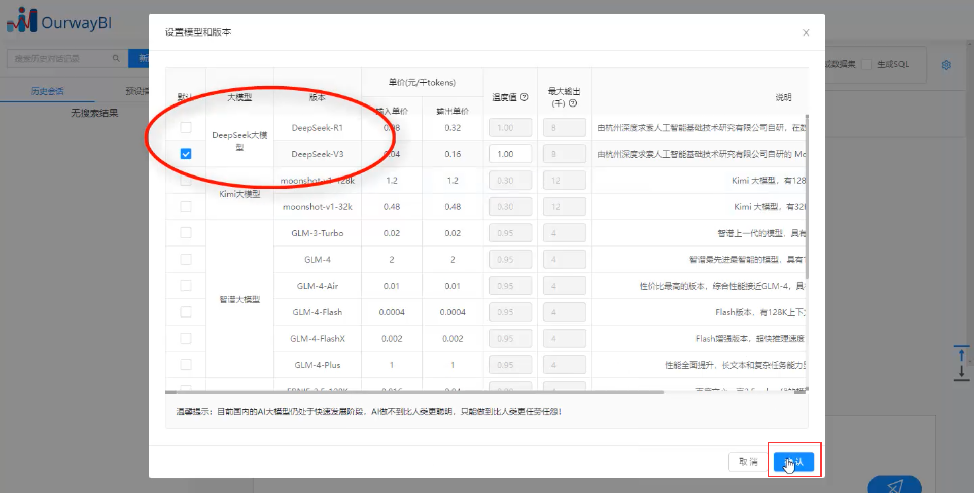 我们点击“AI助手”,第一次使用的时候,系统会要求选择调用的AI模型,这里我们选择官方的DeepSeek API。