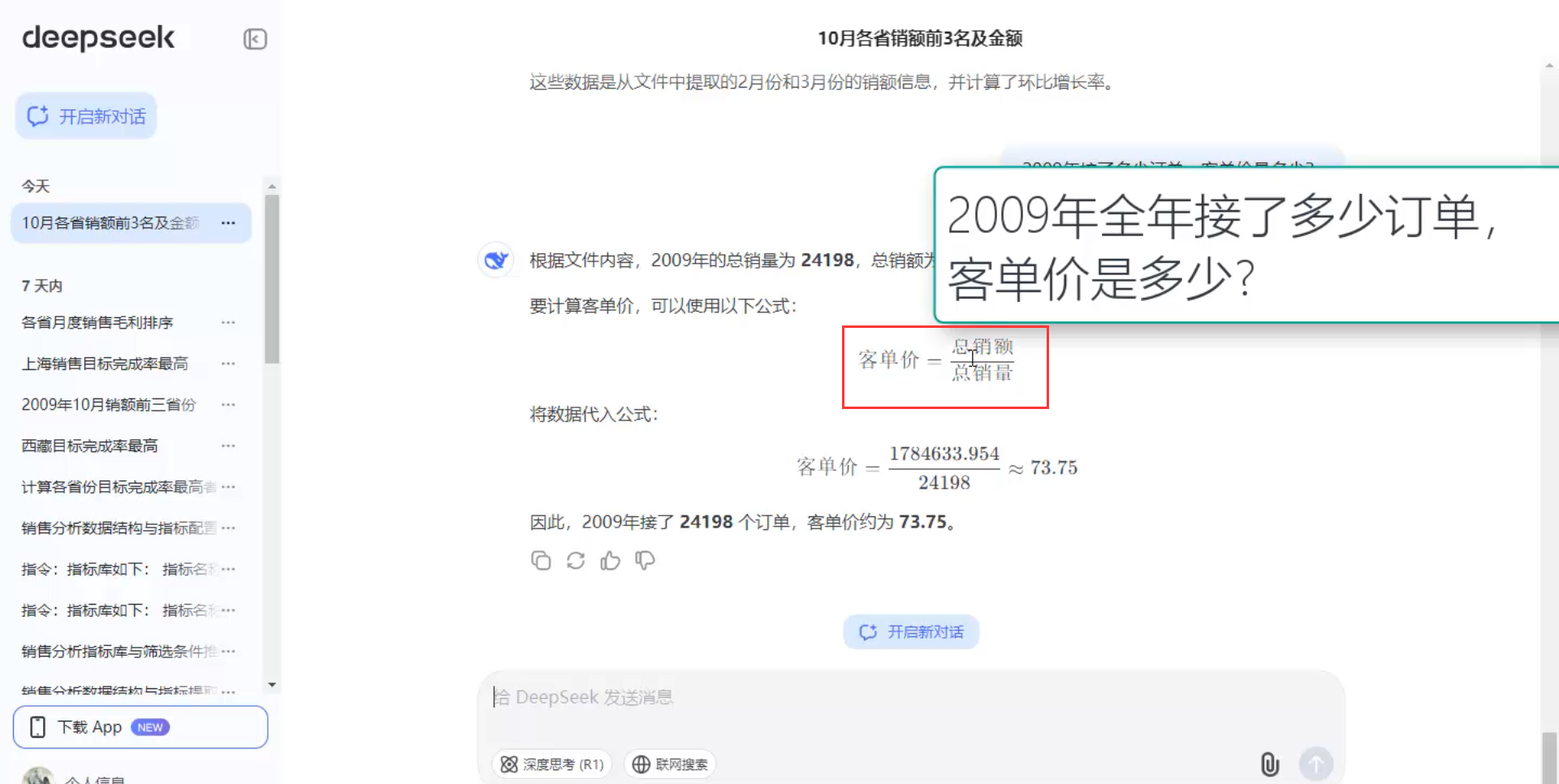我们先问AI,AI给出一个答案,不过,这里应该已经发生了错误,因为客单价应该是销额除订单数,而不是销量。