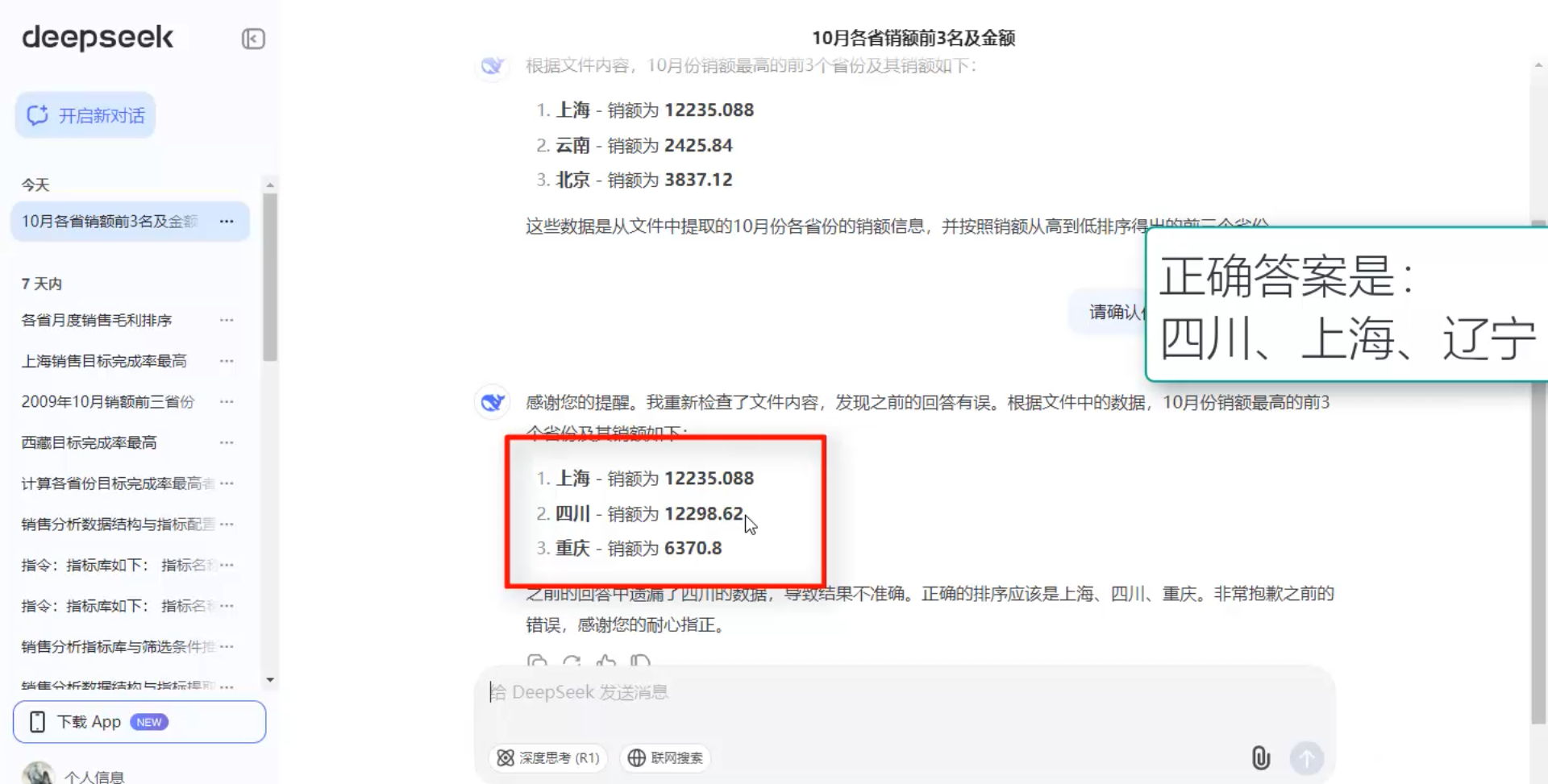 考虑到排序或对比小大这种场景是数据分析中非常常见的,所以,我们可以基本上认为,是无法直接使用DeepSeek进行数据分析的。