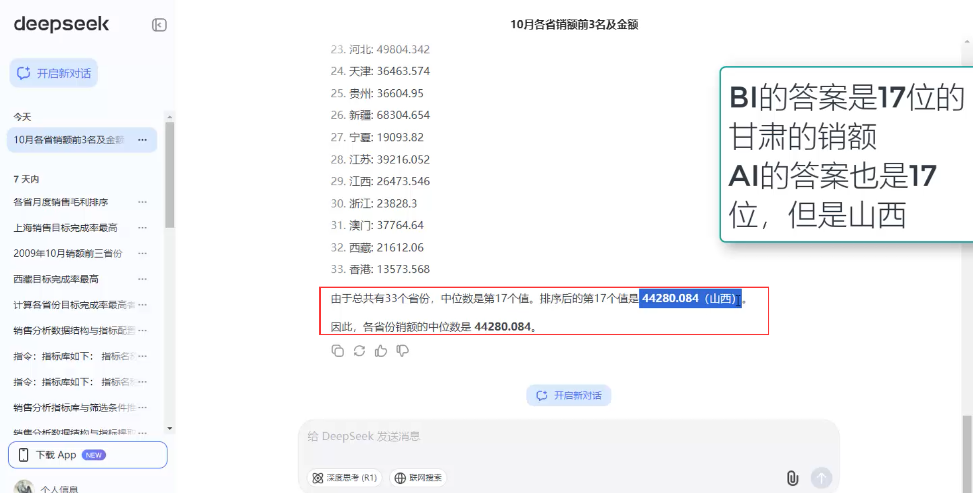 AI的中位数用的是第17位的山西的销额,这里我们可以看到,AI按降序排序时已经出现了错误,第16名湖南的销额,比第17名山西的还低。因为AI排序的错误,导致了最终答案的错误。