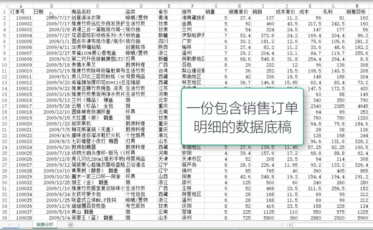 首先我们有这么一张销售订单明细的数据底稿EXCEL,接下来,我们尝试用官方的DeepSeek以及奥威BI+DeepSeek来进行数据分析,对比一下。