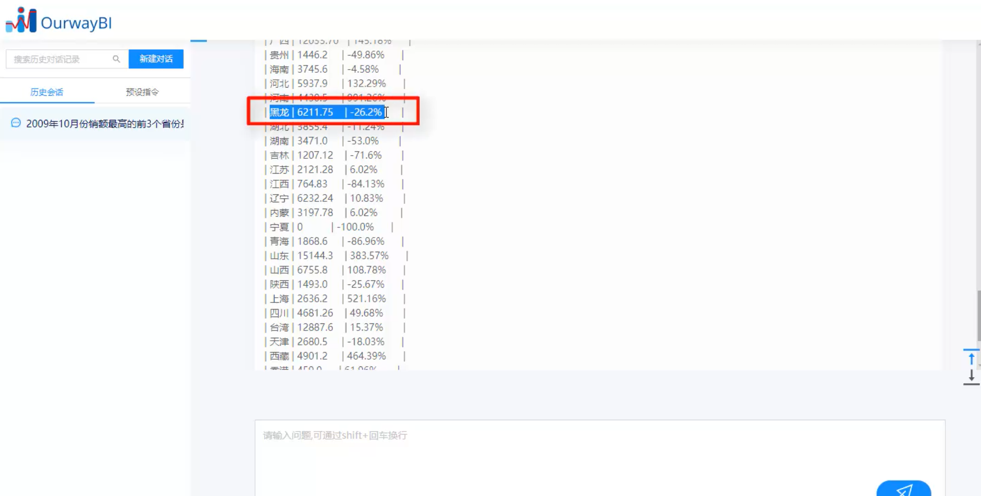我们抽查对比一下两边的答案,AI的黑龙江的环比是-26.19%,BI的是-26.2%。