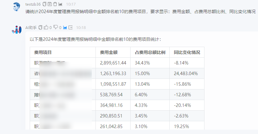 【费用管控】请统计2024年度管理费用报销明细中金额排名前10的费用项目,要求显示:费用金额、占费用总额比例、同比变化情况