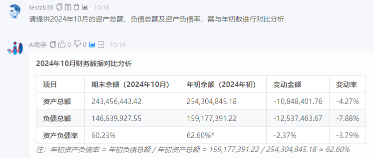 【比率分析】请提供2024年10月的资产总额、负债总额及资产负债率,需与年初数进行对比分析