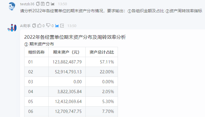 【资产分析】请分析2022年各经营单位的期末资产分布情况,要求输出:①各组织金额及占比 ②资产周转效率指标