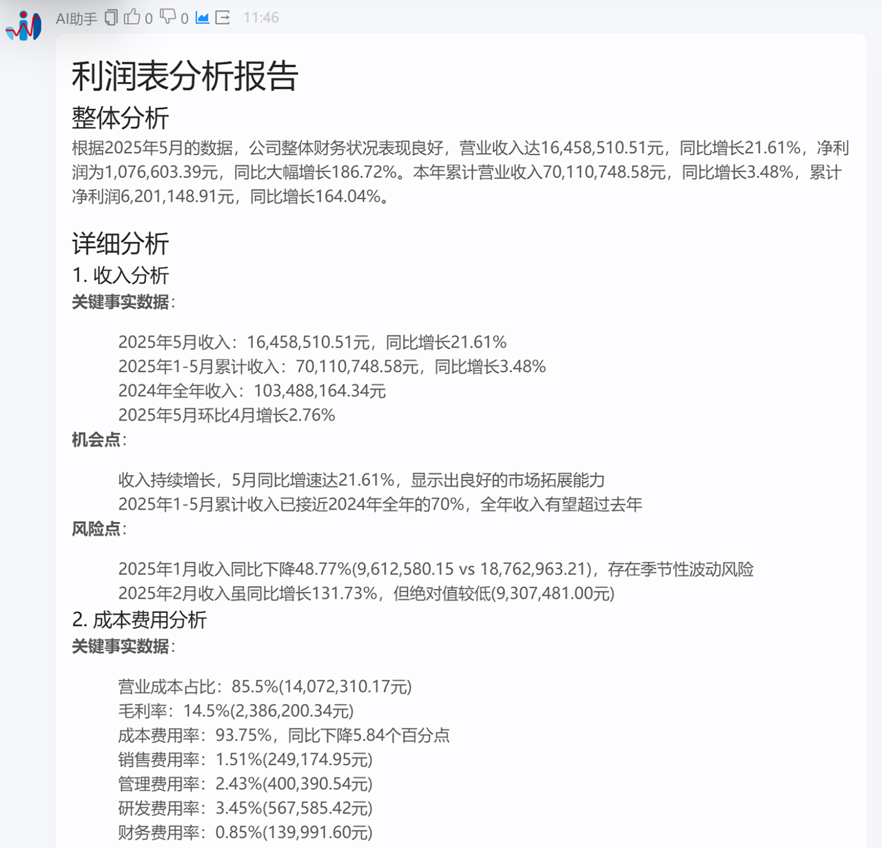 邹斌顾问还在现场展示了一个场景:只要告诉AI,请深度解读上个月的经营风险,并输出详细的报告。AI就会开始理解我们的意图,并调用它的知识,去思考,如果要进行经营风险的分析,需要从哪几个问题着手,然后,再尝试从我们现有的ERP数据中,找到它想要的数据,再按要求输出详细的经营风险分析报告。