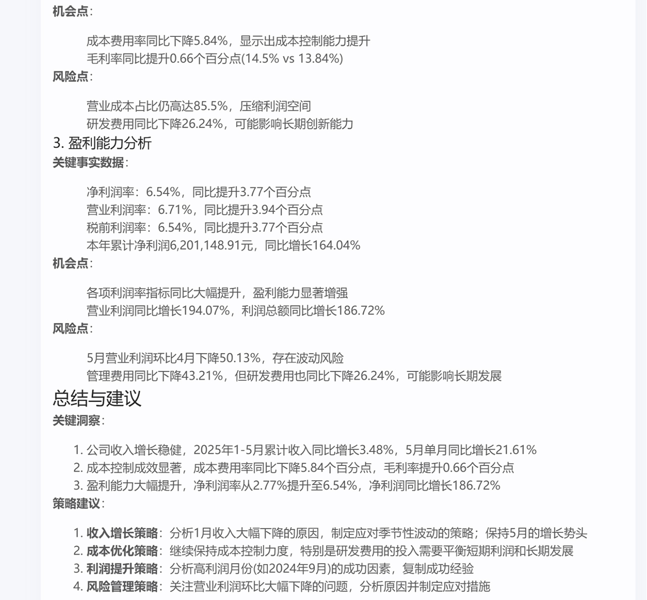 而借助奥威 AI 能力在 BI 报表基础上进行解读,然后输出分析报告,彻底改变了这一局面。它既可以输出纯文字报告,也能生成图文报告,最核心的优势在于直接点明数据中蕴含的机会点或风险点,并给出明确的结论与建议,省去了企业花费大量时间分析和解读数据的过程,让决策更高效。