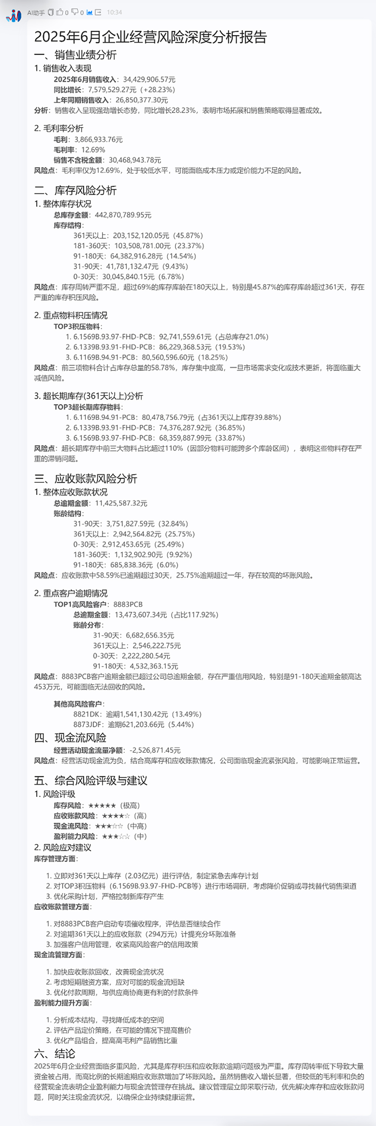 这份报告分别从销售风险、库存风险、应收账款风险、现金流风险等不同角度进行展示,最后,它对风险进行了评级,并给出了详细的风险应对建议。