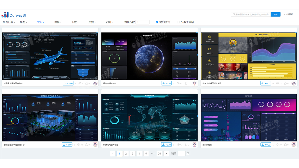 (5)海量大屏模版,一键套用:奥威ChatBI内置模板秀模块,有各种各样的大屏可视化模版,能够一键下载套用,节省大量的时间精力。