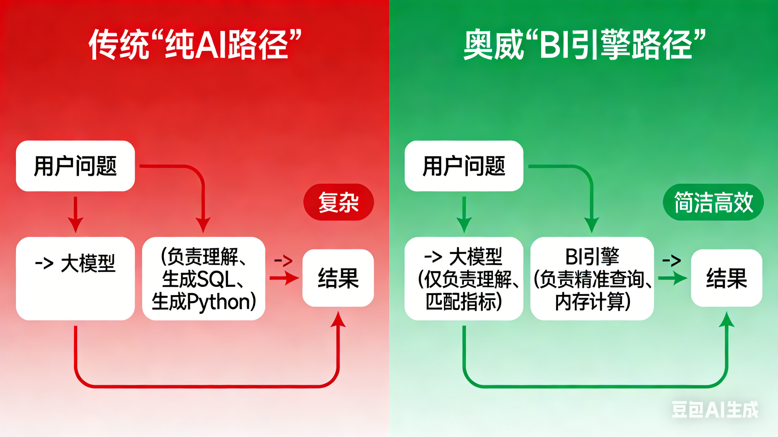 那么,有没有一条路,能彻底跨越这堵准确率的“高墙”?奥威软件旗下的 奥威AI数据智能体 给出了一份截然不同的答卷:以成熟的BI(商业智能)系统作为核心计算引擎,让AI专注于它最擅长的事——理解人类意图。