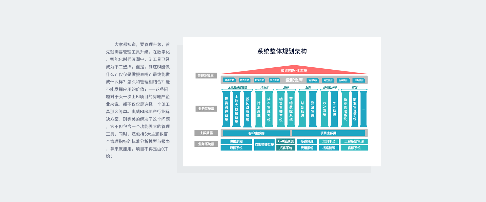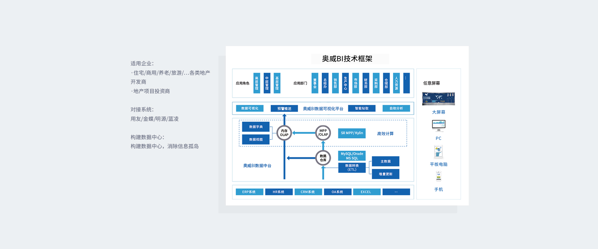 · 奥威软件18年行业方案积淀,快速对接房地产内部各类信息系统数据。