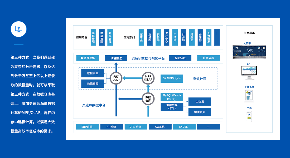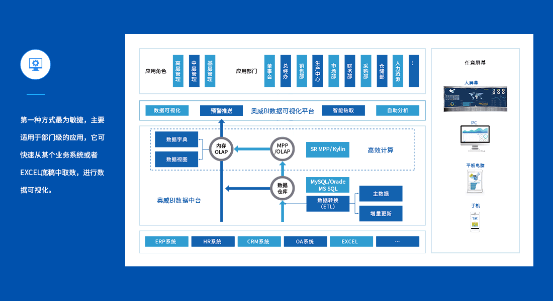 奥威BI提供三种不同的技术路线,满足不同应用场景下的需求,这三种技术路线是可以同时并存的,这样,不论是集团性应用,还是企业级应用,亦或者是部门级应用,都可以通过一个产品柔性满足。
