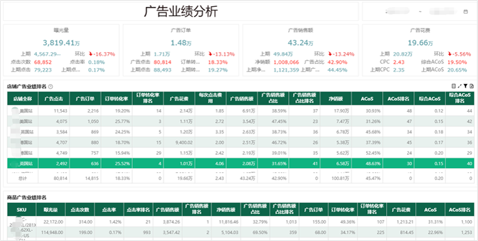 精准掌握广告的投放效果 ☑ 从曝光—>点击—>下单等不同环节来掌握广告的投入产出情况; ☑ 通过店铺广告投入各项指标的排名,可以识别出哪些SKU点击率很高,转化却很低。