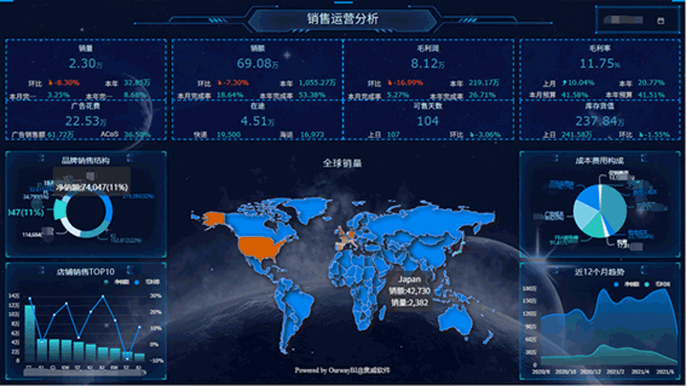 通过总的管理驾驶舱,轻松掌握: ☑ 各销售指标的当期、环比、本年累计及目标完成情况; ☑ 各广告、库存相关指标的当期、环比情况; ☑ 各品牌的销售占比情况; ☑ 哪些店铺的销售贡献较大? ☑ 各成本费用的占比情况; ☑ 近12个月的销售情况; ☑ 全球销售覆盖情况。
